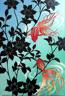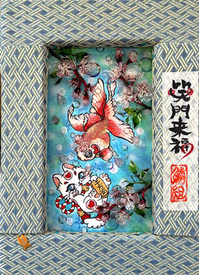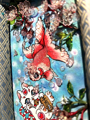 大阪市 鱗組 aco 様 「笑門来福」 SM(約16×23cm) UVレジン、Dip Art用樹脂液、水性アクリル 金魚と猫は平面で、お花がディップアートという立体作品です。 |